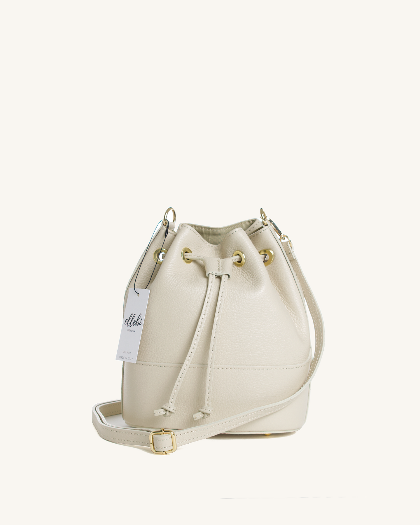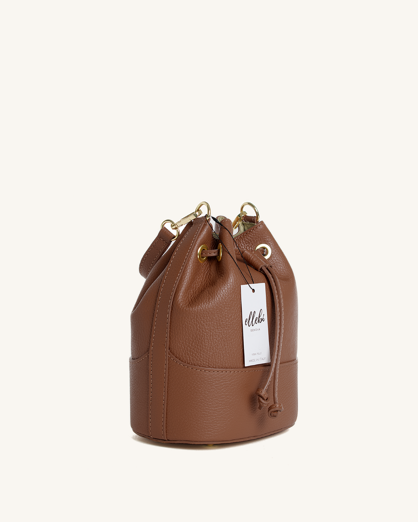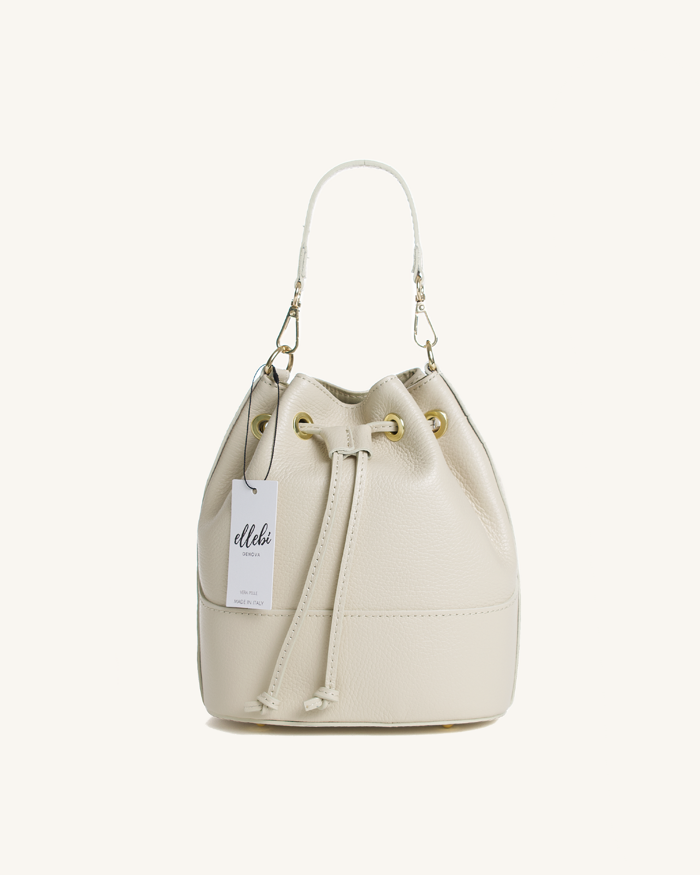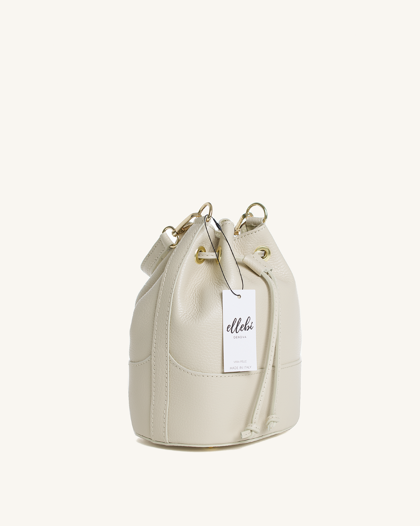Realizzato in pregiato pellame italiano, questo secchiello rappresenta l'essenza dello stile contemporaneo. La sua silhouette morbida e la chiusura a coulisse con dettagli dorati creano un perfetto equilibrio tra raffinatezza e praticità.