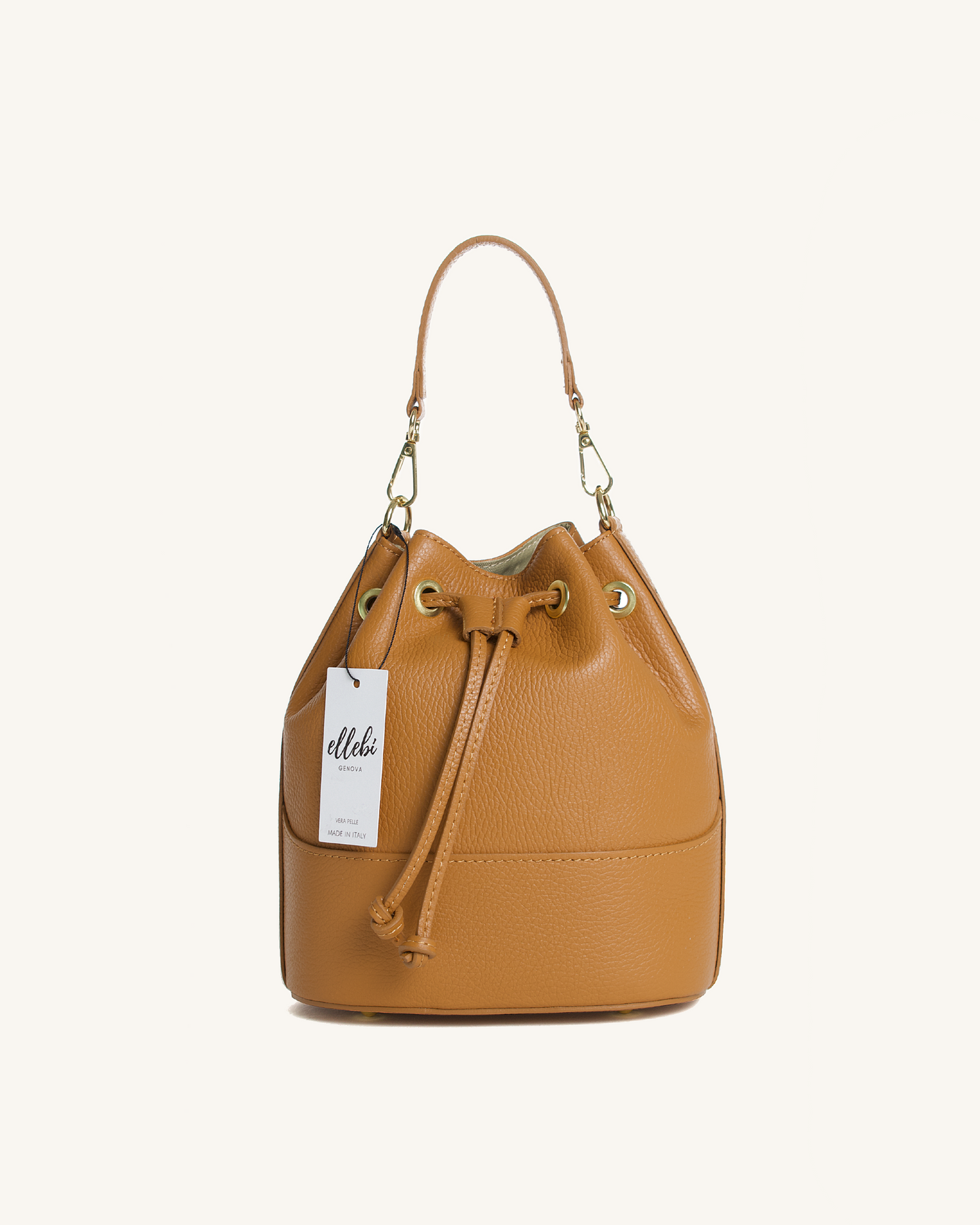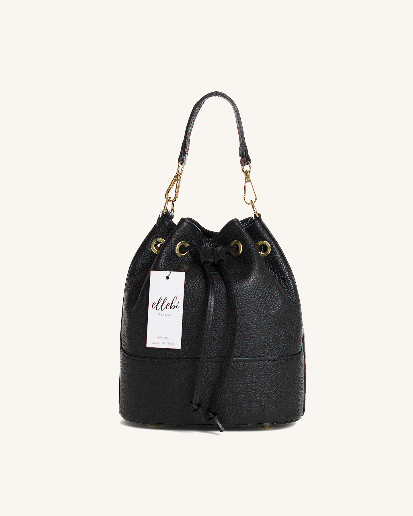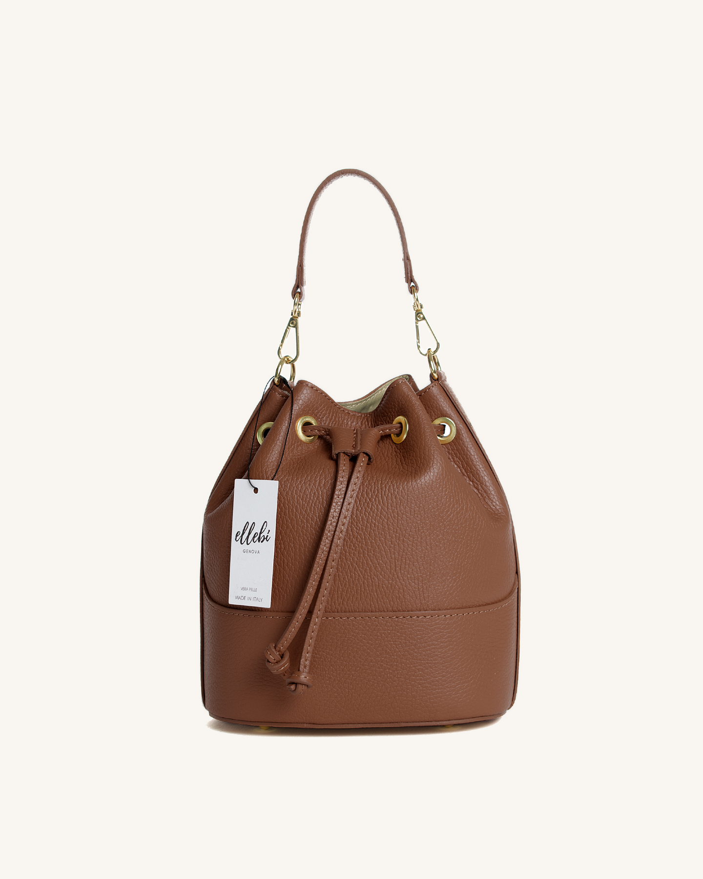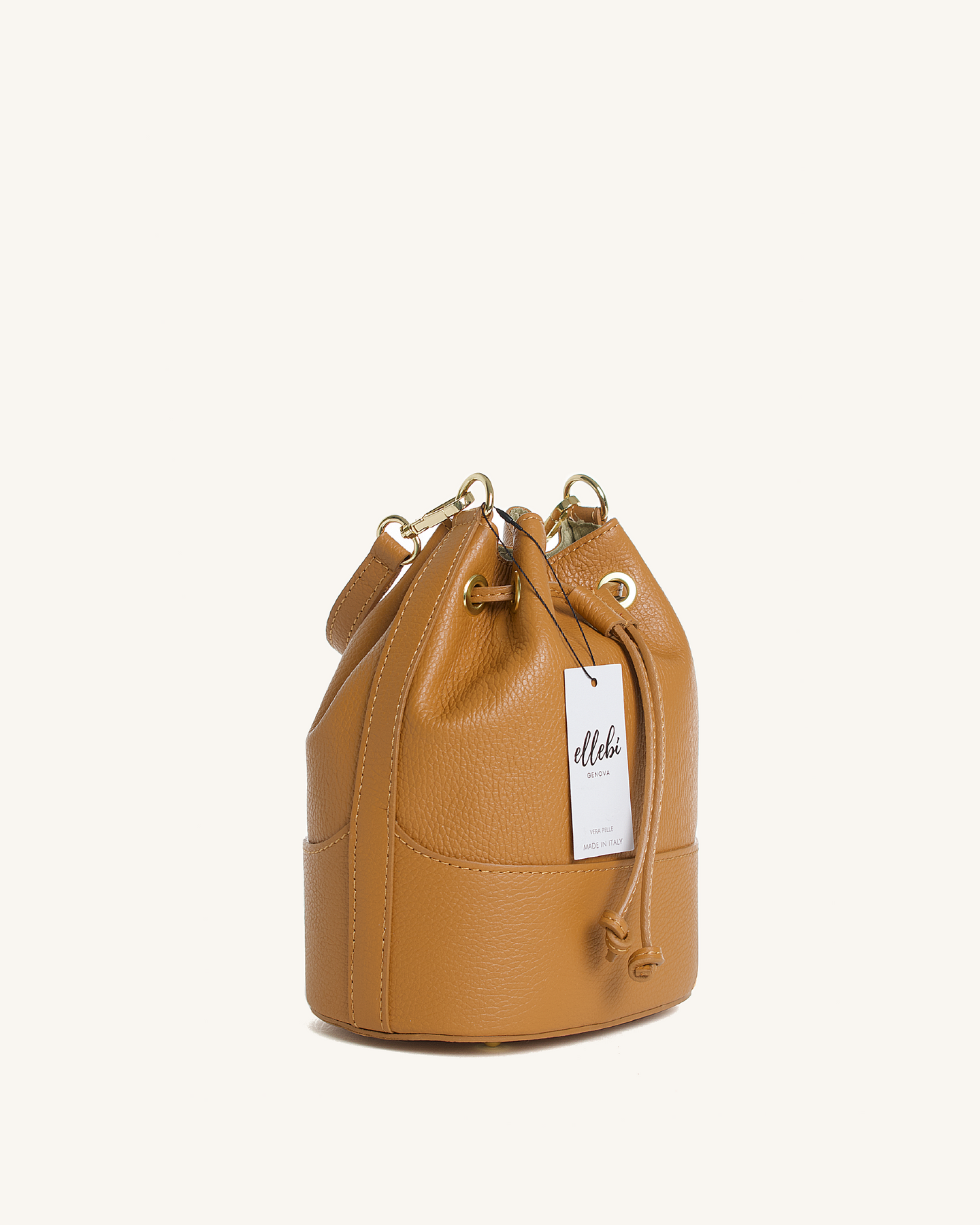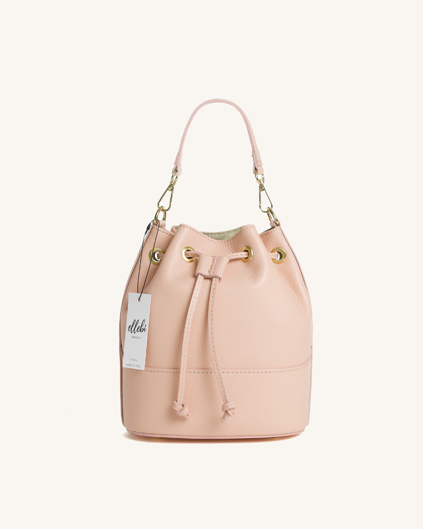 Realizzato in pregiato pellame italiano, questo secchiello rappresenta l'essenza dello stile contemporaneo. La sua silhouette morbida e la chiusura a coulisse con dettagli dorati creano un perfetto equilibrio tra raffinatezza e praticità.