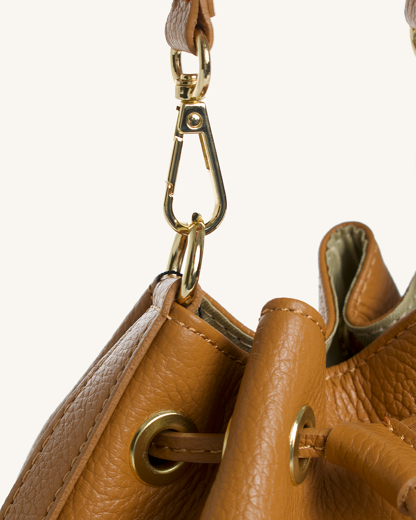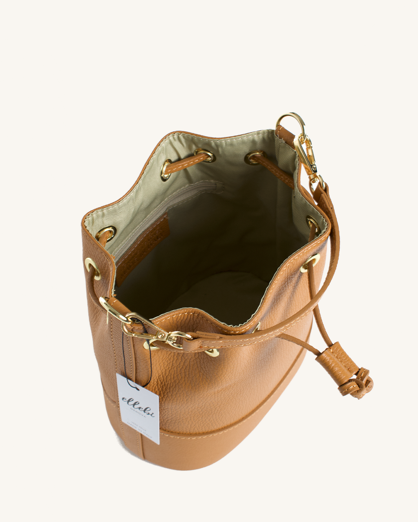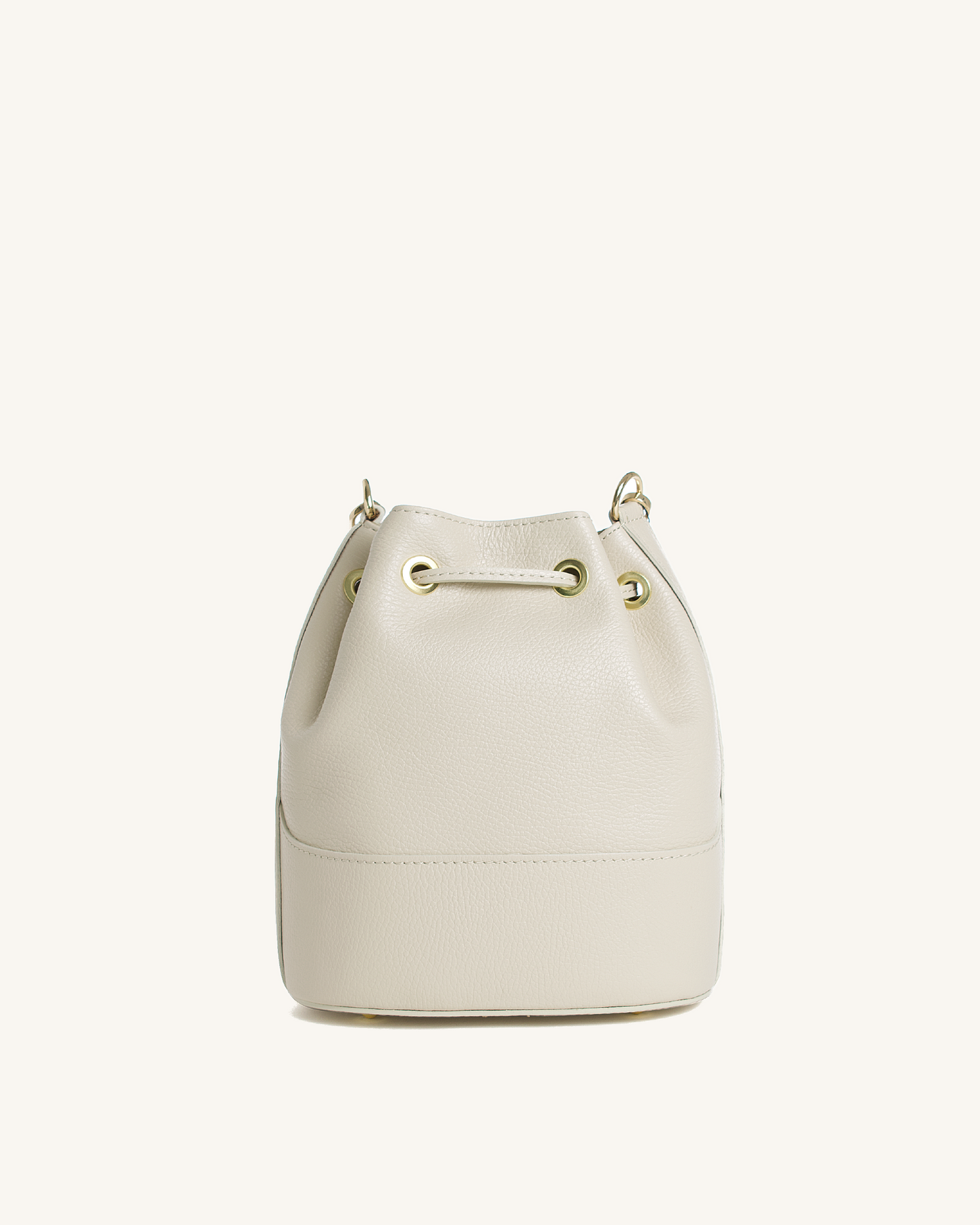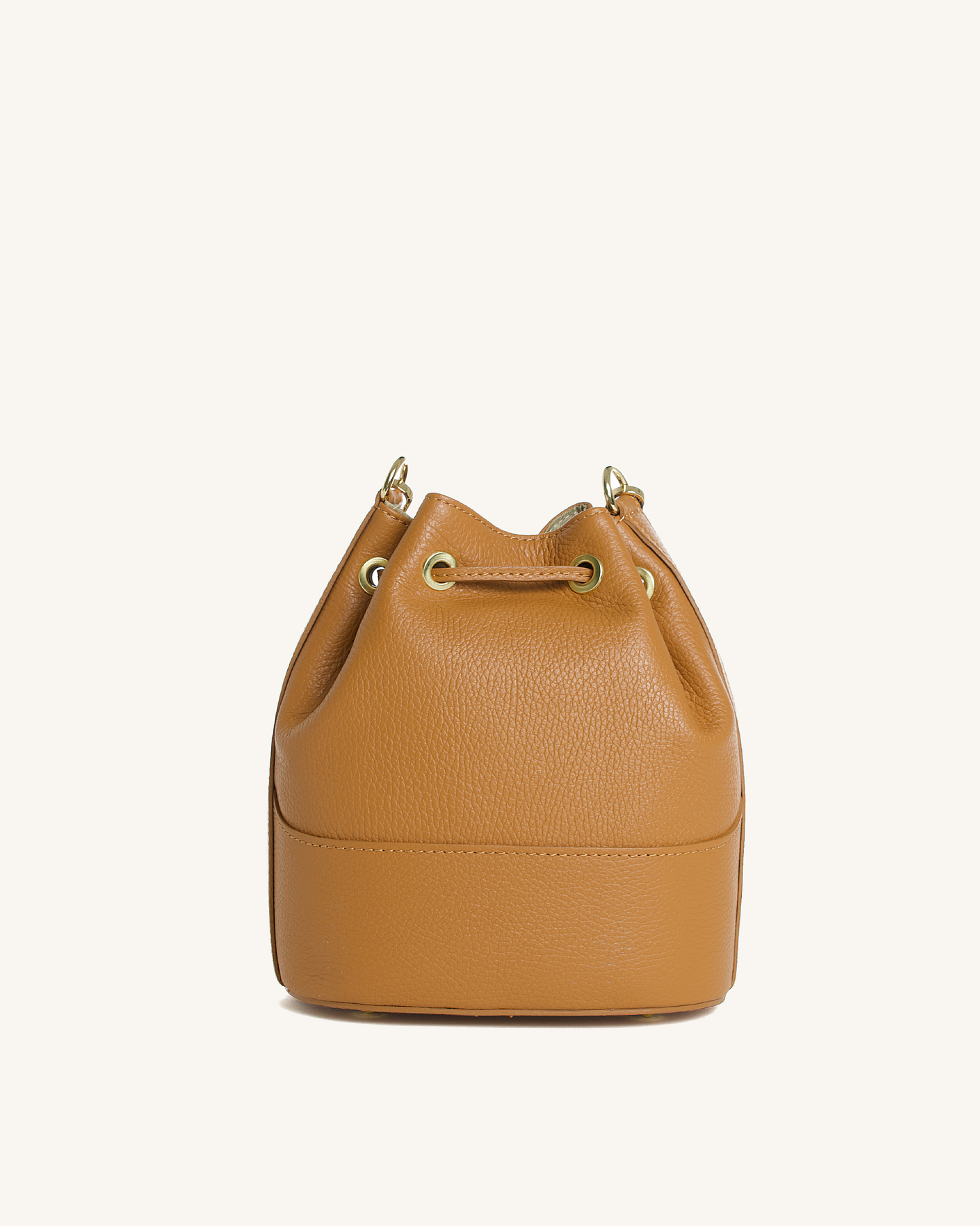 Realizzato in pregiato pellame italiano, questo secchiello rappresenta l'essenza dello stile contemporaneo. La sua silhouette morbida e la chiusura a coulisse con dettagli dorati creano un perfetto equilibrio tra raffinatezza e praticità.