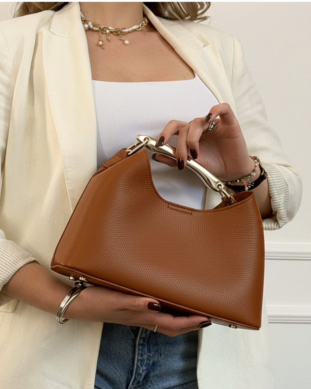 Borsa SOLE in vera pelle dollaro con tracolla regolabile da 74 a 135 cm, perfetta per ogni occasione. La pochette estraibile in pelle tono su tono aggiunge versatilità e praticità. Interno in effetto velluto e accessori metallici in finitura oro completano il design elegante. Realizzata interamente in Italia, combina artigianalità e lusso in un formato compatto e raffinato.