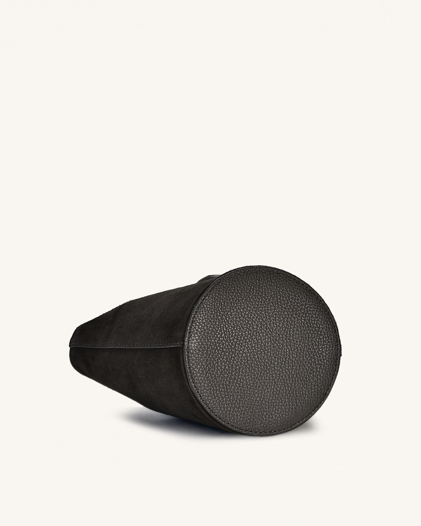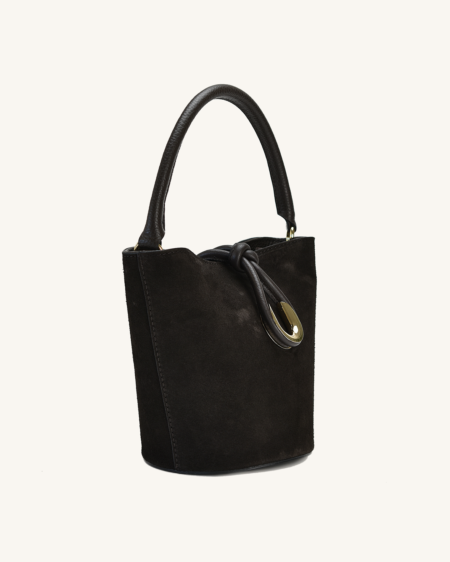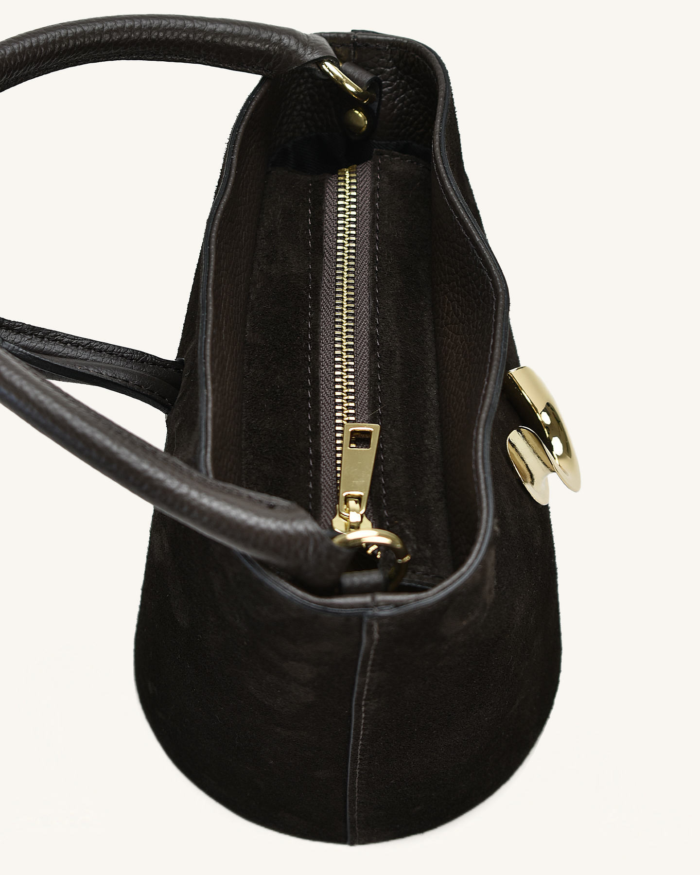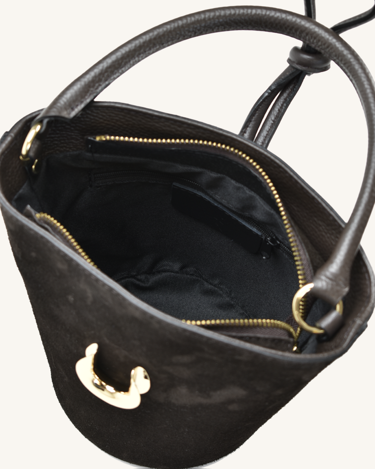 La borsa MIA in camoscio è un perfetto esempio di eleganza minimalista. Con la sua silhouette a secchiello e il dettaglio distintivo dell'anello metallico dorato, questa borsa unisce funzionalità e stile in un design senza tempo che non passa mai di moda.
