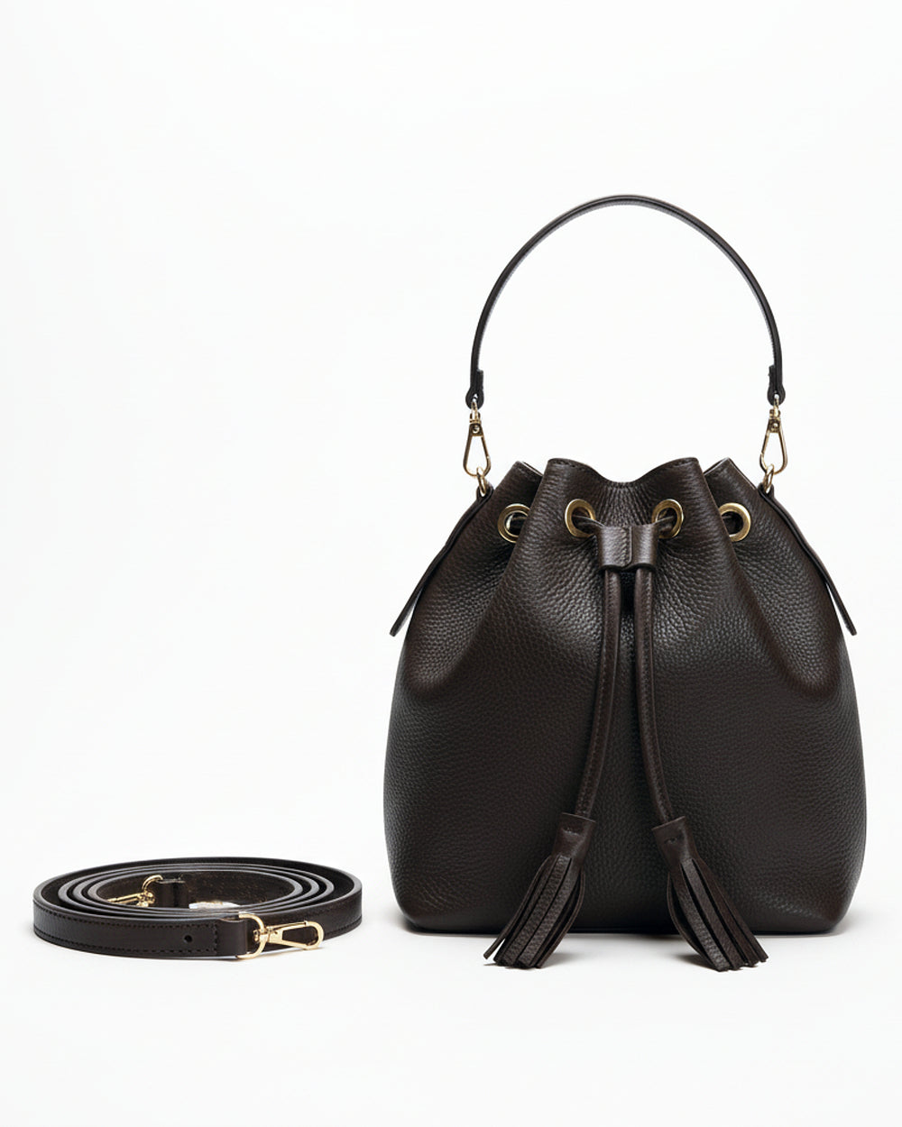 Secchiello LINDA in vera pelle dollaro con tracolla regolabile e manico a spalla entrambi rimovibili, chiusura a coulisse perfetta per ogni occasione. Interno in tessuto con tasca e accessori metallici in finitura oro completano il design elegante. Realizzata interamente in Italia.