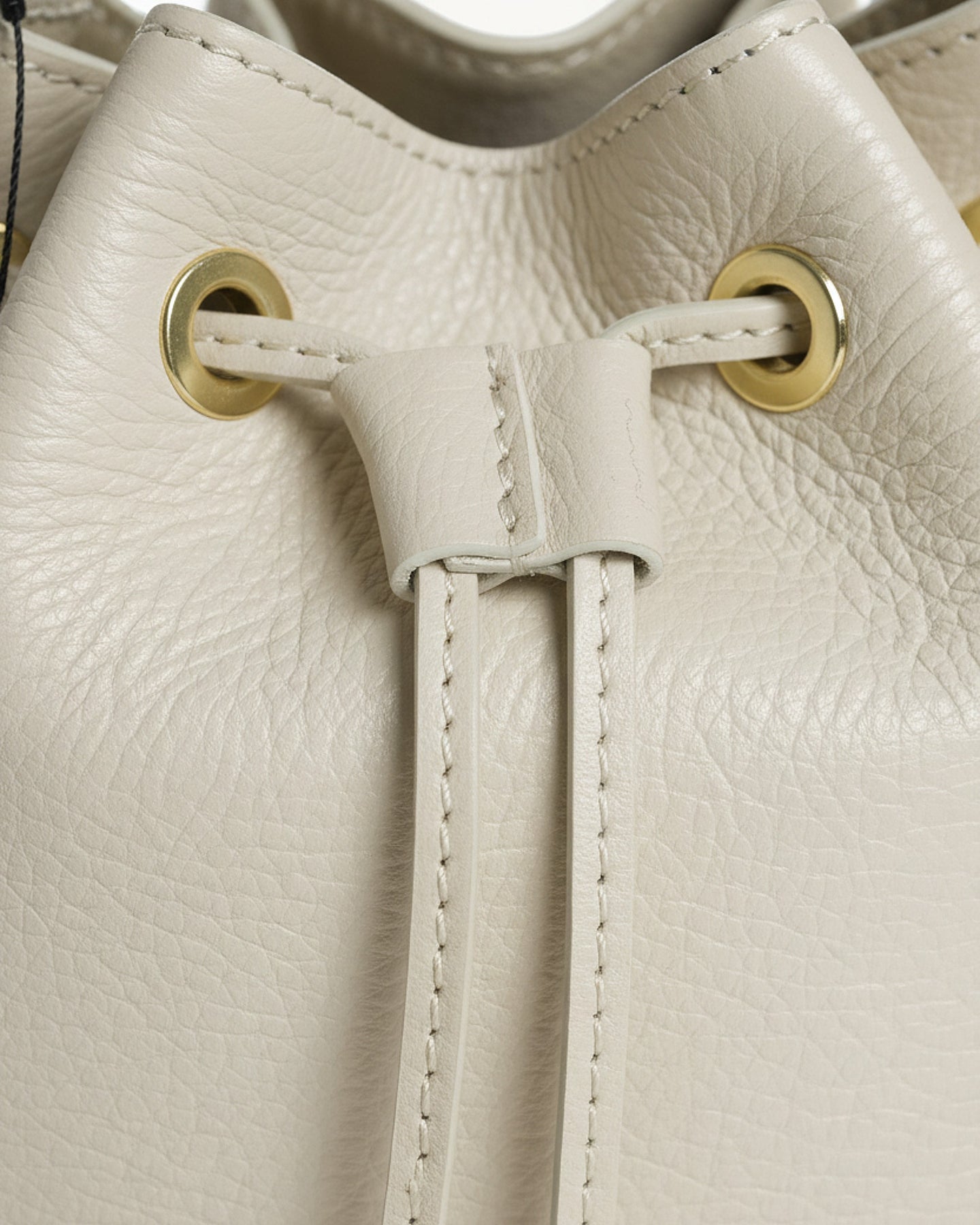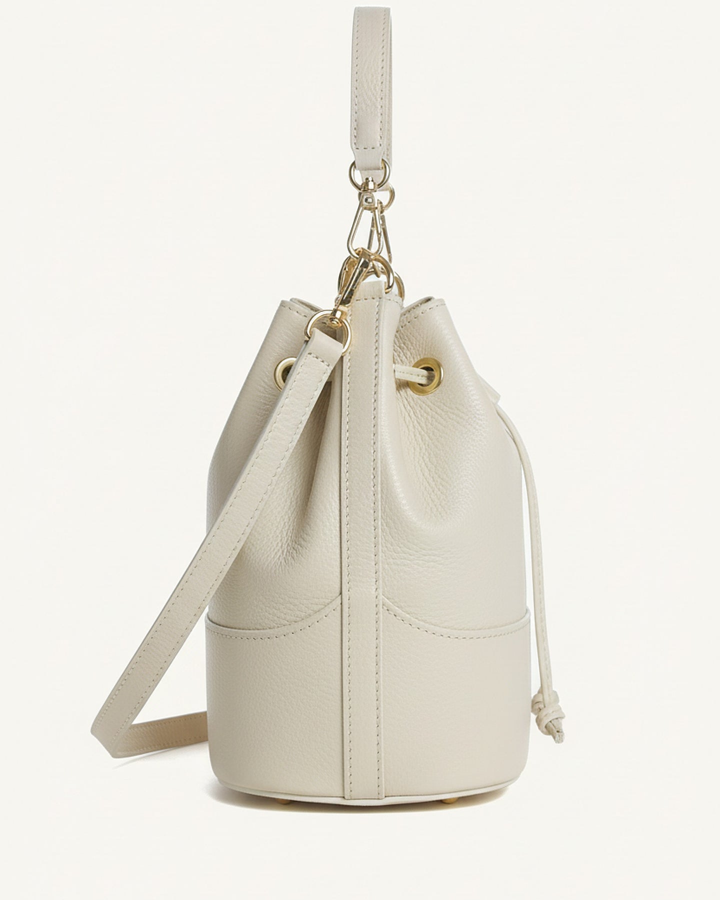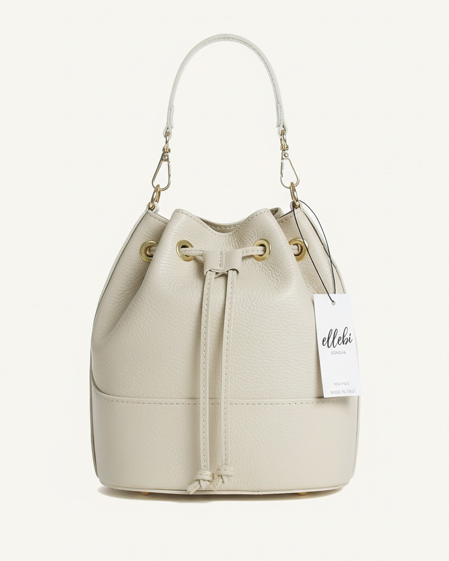 Realizzato in pregiato pellame italiano, questo secchiello rappresenta l'essenza dello stile contemporaneo. La sua silhouette morbida e la chiusura a coulisse con dettagli dorati creano un perfetto equilibrio tra raffinatezza e praticità.
