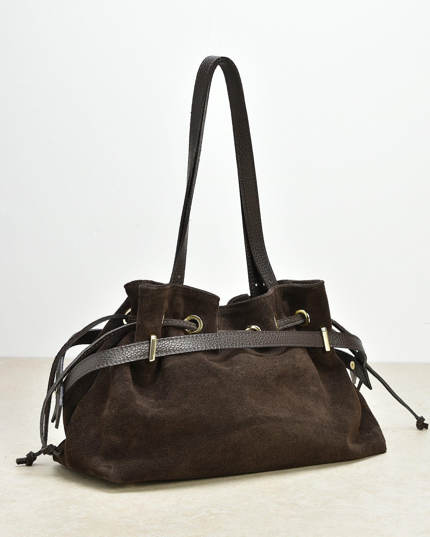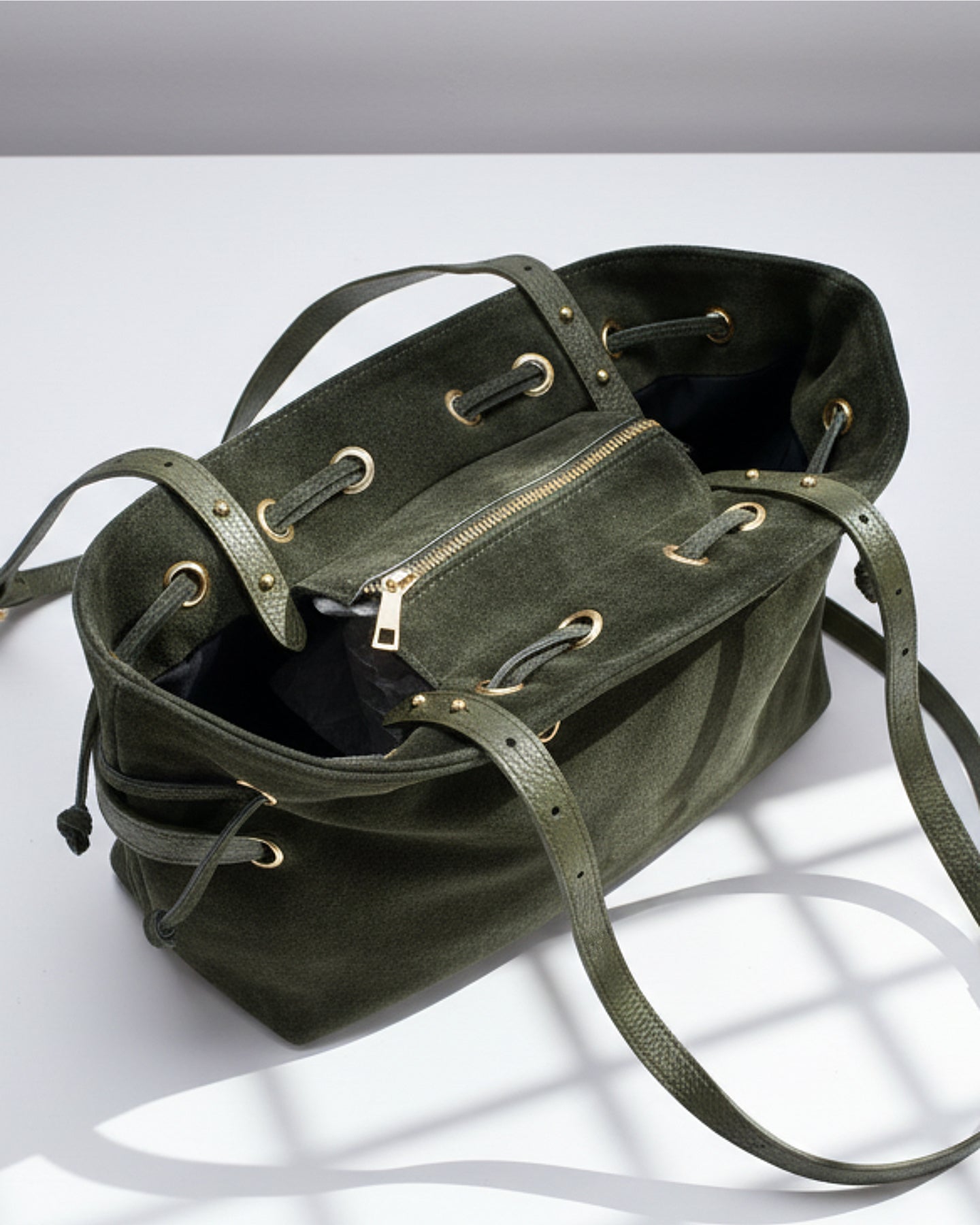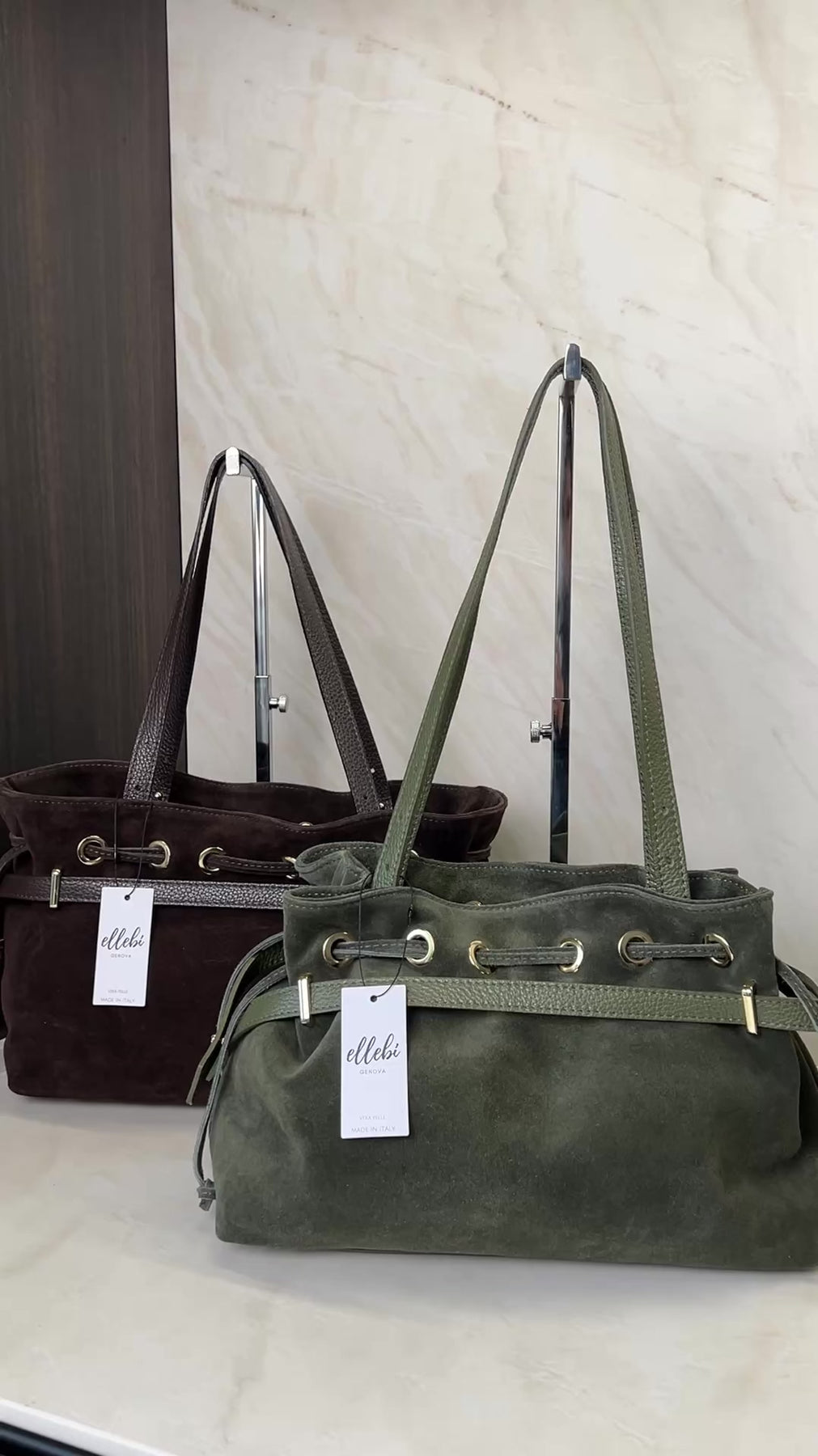 Michelle unisce eleganza e funzionalità con la sua doppia portabilità. Realizzata artigianalmente in Italia con morbidissima pelle suede. I manici regolabili in pelle dollaro la rendo perfetta per essere portata a spalla. Chiusura a coulisse e zip, doppia dimensione gestibile a piacere con semplici laccetti laterali.
