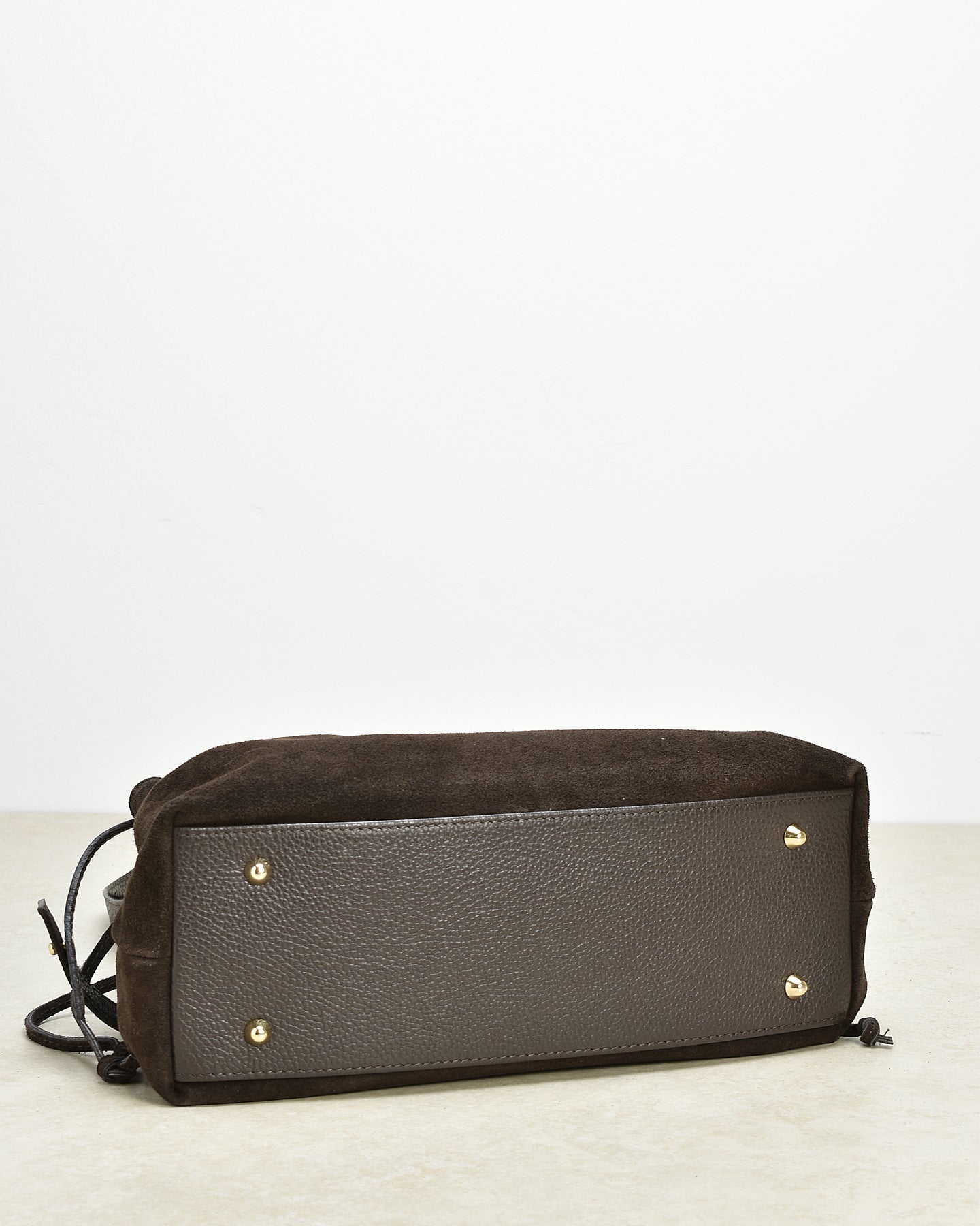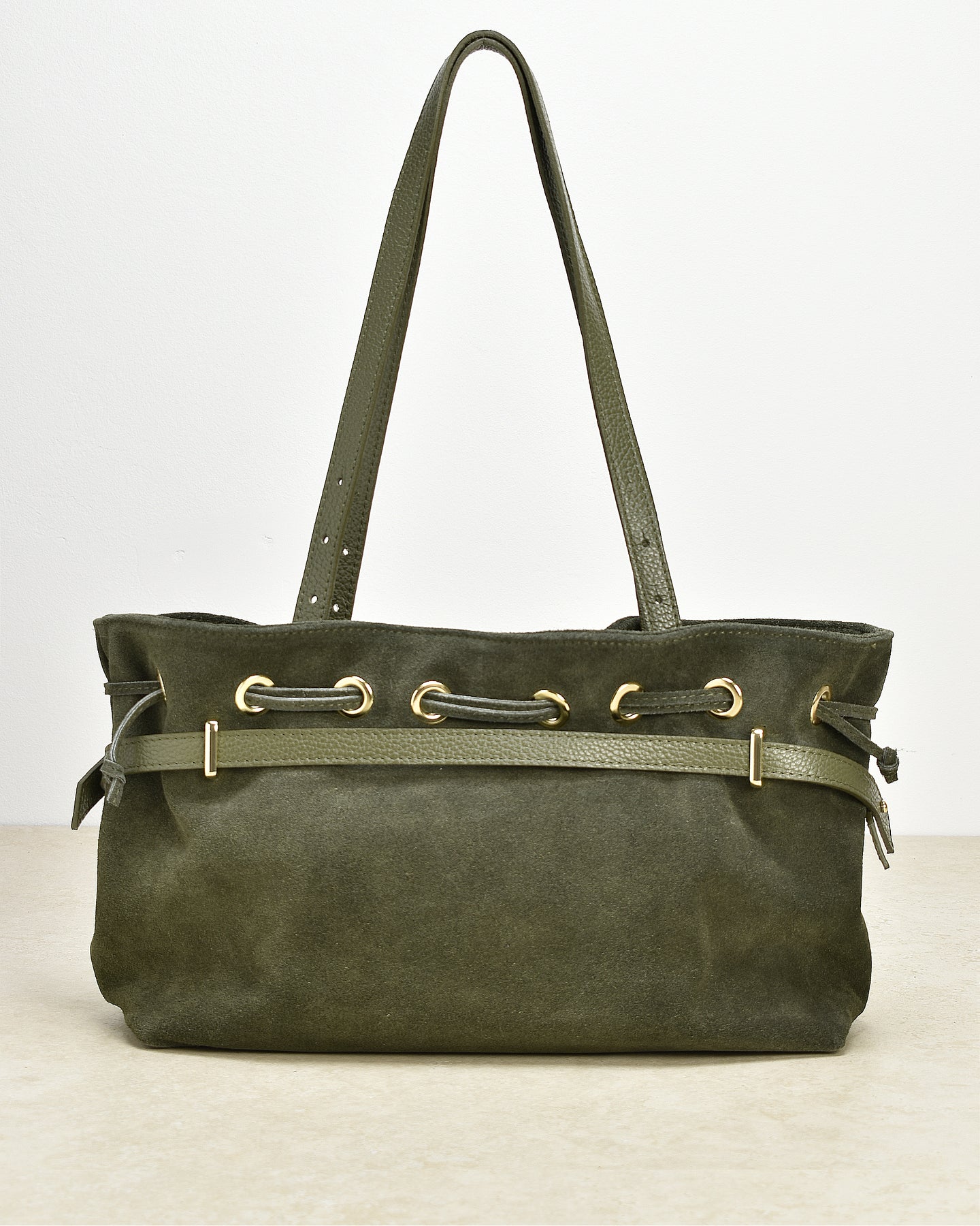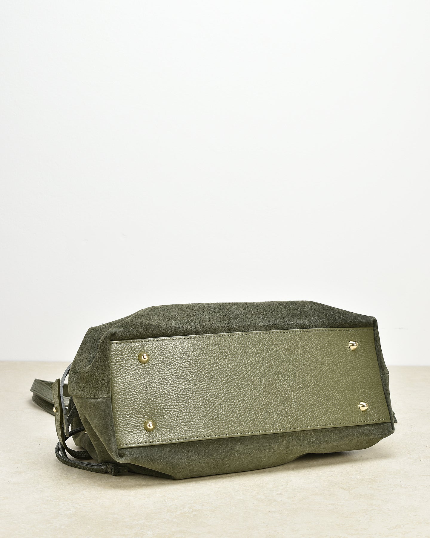 Michelle unisce eleganza e funzionalità con la sua doppia portabilità. Realizzata artigianalmente in Italia con morbidissima pelle suede. I manici regolabili in pelle dollaro la rendo perfetta per essere portata a spalla. Chiusura a coulisse e zip, doppia dimensione gestibile a piacere con semplici laccetti laterali.